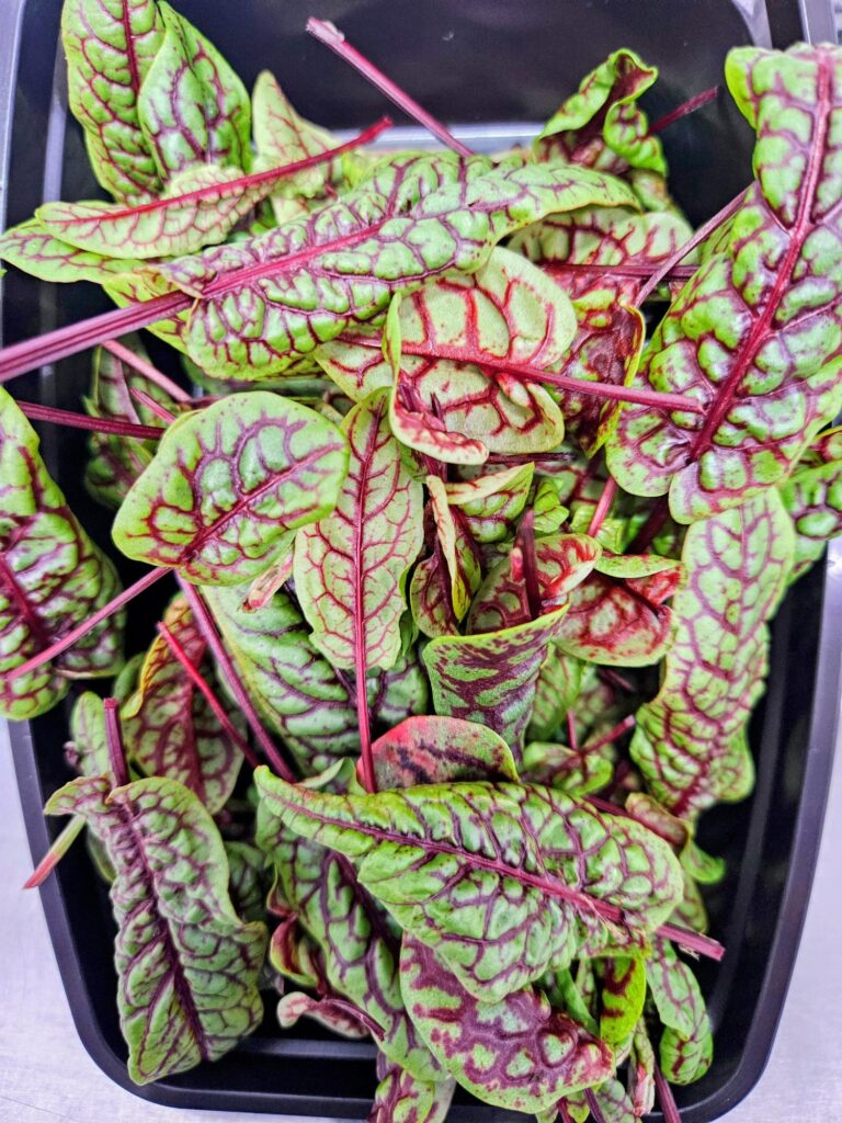 Red Veined Sorrel, bright green leaves with contrasting, dark maroon stems and veins. Same sharp, tangy flavor as regular sorrel.